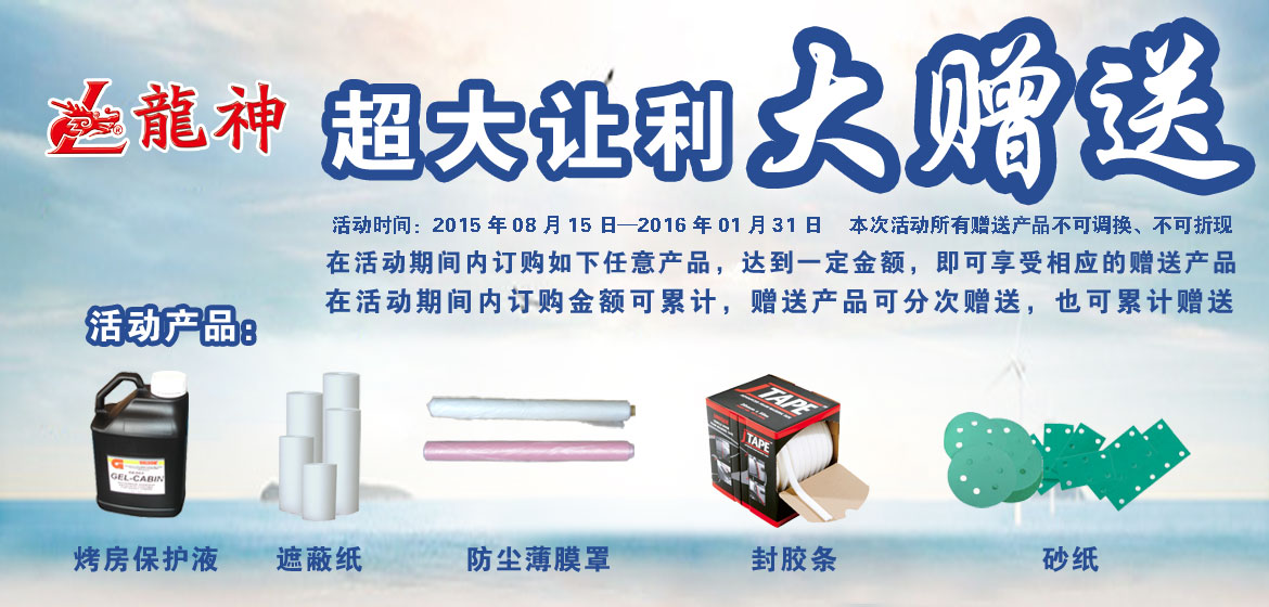 超大讓利﹒大贈送 2015-08-17 31891 訂購產(chǎn)品:1、烤房保護液; 2、遮蔽膜; 3、遮蔽紙; 4、泡沫膠條; 5、砂紙。 在活動期間內(nèi)訂購如上任意產(chǎn)品,達到下表累計金額,即可享受相應(yīng)的贈送產(chǎn)品。