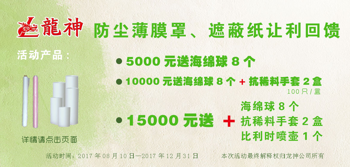 夏季讓利大回饋,遮避膜優(yōu)惠大促銷 2015-06-05 30174 買滿3000元,贈送紙漏斗500個; 買滿5000元,贈送除漆洗手膏1箱; 買滿8000元,贈送標(biāo)準(zhǔn)抹塵布1箱/24盒; 買滿10000元,贈送小切紙架1臺 。